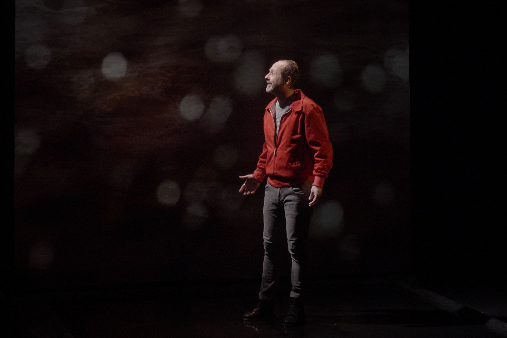 Le spectacle évoluera dans un univers brumeux, un flou artistique à l’image de la pensée du personnage de notre histoire, il y aura les embruns, il y aura la pluie. Cet espace, posé ni trop à jardin, ni trop à cour, ni à l’avant scène, ni trop au lointain mais juste pile au théâtre du plateau vide sera comme un îlot, une tranche de vie, une carotte glacière qui témoignera de l’histoire de la vie d’un homme comme un gros plan de cinéma. Comme sur un plateau de cinéma, la technique est très présente, elle est visible, elle est autour et au dessus de cet espace, c’est l’œil qui voit, c’est la pensée qui dirige.